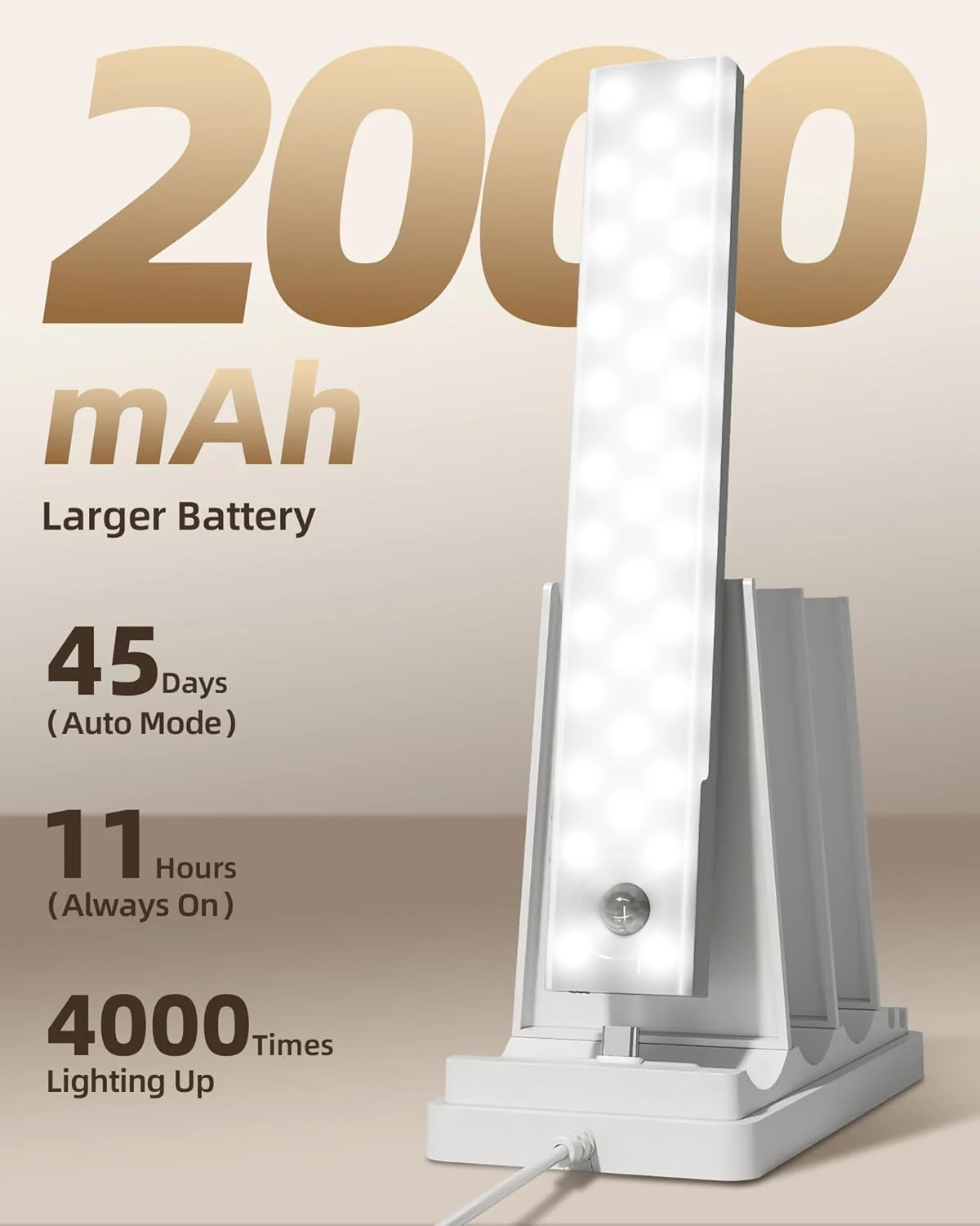 ăLong Battery Life & Smart ChargingăThe 2000mAh rechargeable battery lasts 13â40 days in Auto Mode or up to 11 hours on full brightness in Always-On. The 3-slot USB-C dock powers 3 lights at once, reducing clutter and keeping your workspace tidy, and can even charge phones or earbuds.